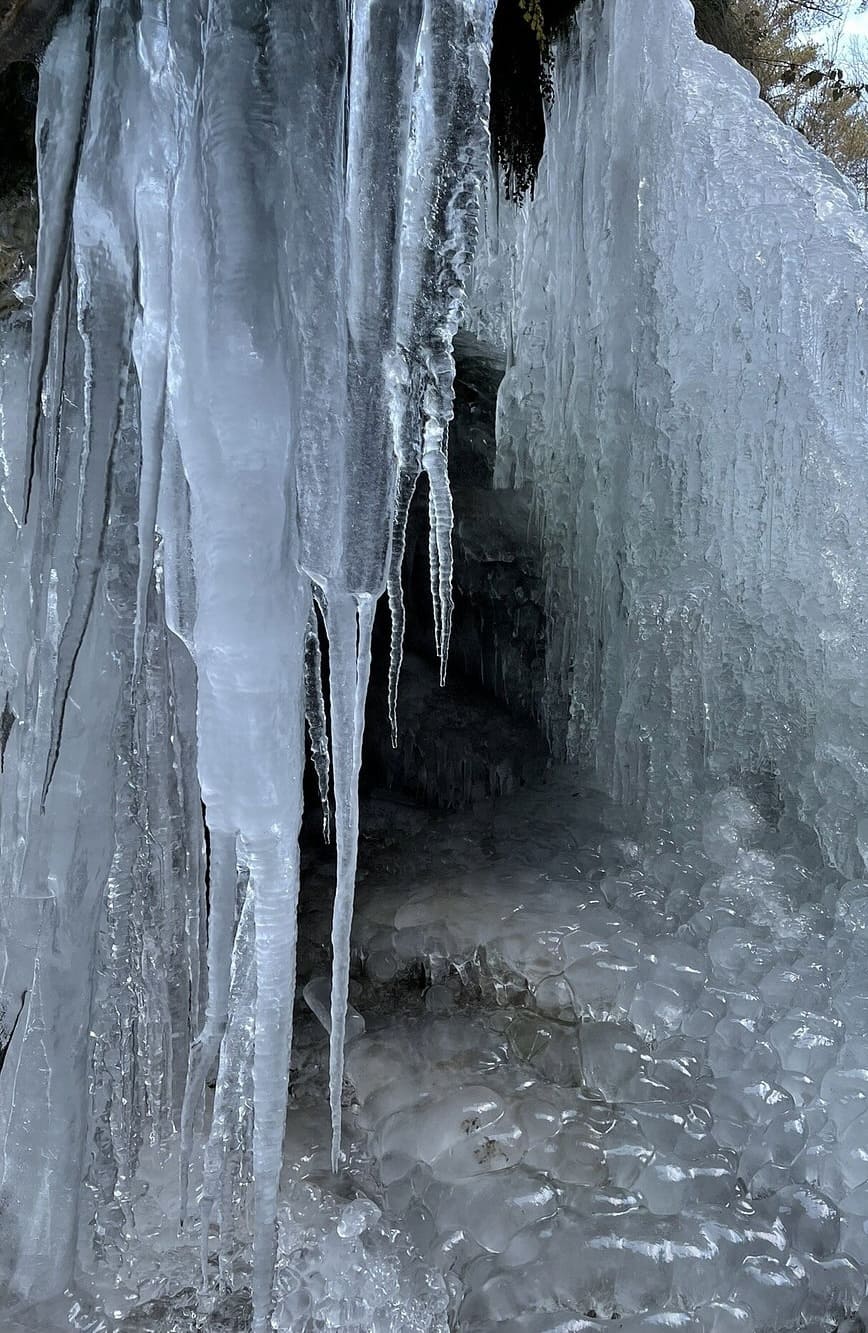 Si vous partez avec des enfants, le plus sûr (et le plus amusant) est d’observer les gorges depuis un rocher stable et de transformer l’excursion en une petite chasse aux glaçons suspendus — ces mini-pics de glace que l’on trouve accrochés aux racines et aux parois couvertes de mousse.